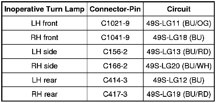 For the LH front turn lamp, REPAIR circuit 49S-LG5 (BU/WH). TEST the system for normal operation. For the RH front turn lamp, REPAIR circuit 49S-LG2 (BU/RD). TEST the system for normal operation. For the LH rear turn lamp, REPAIR circuit 49S-LG12 (BU). TEST the system for normal operation. For the RH rear turn lamp, REPAIR circuit 49S-LG19 (BU/RD). TEST the system for normal operation.