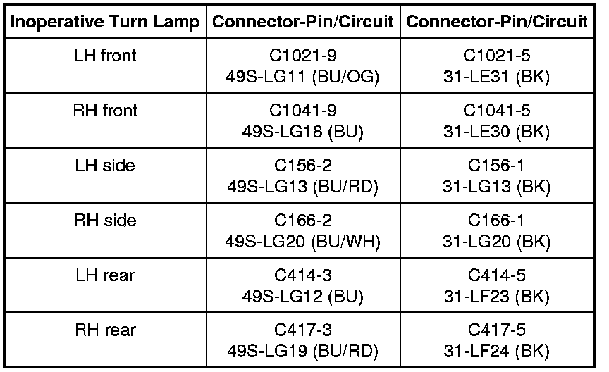 - For an inoperative LH front and side turn lamp, connect a fused jumper wire between the GEM C201e-4, circuit 29-LG26 (OG), harness side and the GEM C201e-3, circuit 49S-LG5 (BU/WH), harness side.