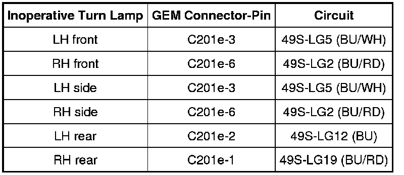 - For an inoperative RH front and side turn lamp, connect a fused jumper wire between the GEM C201e-4, circuit 29-LG26 (OG), harness side and the GEM C201e-6, circuit 49S-LG2 (BU/RD), harness side.