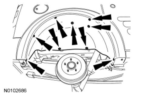 6. Remove the RR wheel and tire. For additional information, refer to Wheels and Tires Removal and Replacement.
