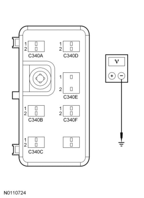 - Measure the voltage between passenger safety belt buckle switch C340D-1, circuit 8-JA55 (WH/BK), harness side and ground.