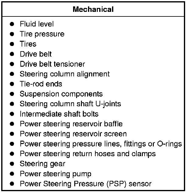 9. If the cause is not visually evident, verify the symptom and GO to Symptom Chart - Steering System or GO to Symptom Chart - NVH. Symptom Chart - Steering System Symptom Chart - NVH