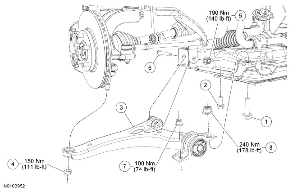 6. Tighten the lower arm forward nut to 190 Nm (140 lb-ft).