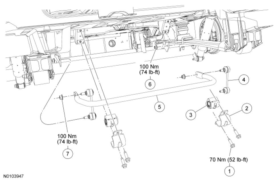 Remove and discard the 4 stabilizer bar bracket bolts. Remove the stabilizer bar brackets and stabilizer bar.