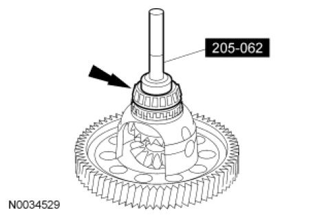 Using the Front Wheel Hub Remover/Installer, Bearing Puller and Step Plate, remove the differential case bearings.