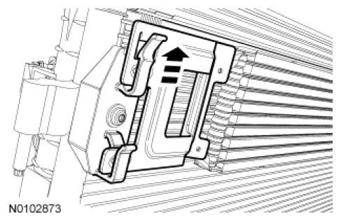 3. NOTE: If the transmission fluid cooler tube latches are not in the unlocked position, compress the tabs on the transmission fluid cooler tube latches and slide the latch out of the transmission fluid cooler tube to unlock the latch.