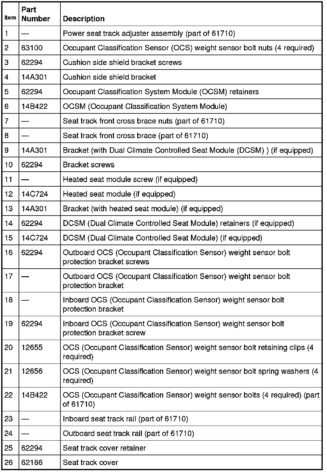 NOTE: To install a new Occupant Classification System Module (OCSM) or an Occupant Classification Sensor (OCS) weight sensor bolt, refer to the appropriate procedure in Restraints and Safety Systems &/or Air Bag Systems.