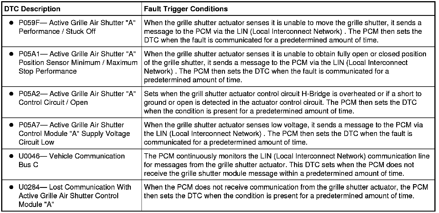 The grille shutter actuator receives fused battery voltage from the Battery Junction Box (BJB). When the engine is started, the actuator carries out a calibration test that can take up to 20 seconds to complete. During this calibration test the actuator moves the shutters through their complete range of motion from full open to full close. If the actuator cannot reach either position, cannot move at all, senses low voltage input or detects an internal short or open, the actuator sends a message to the PCM over a Local Interconnect Network (LIN) indicating a fault. After receiving a fault message for a predetermined amount of time, the PCM sets a DTC.