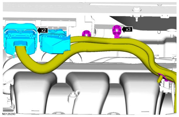 7. Detach the 2 wiring harness/coolant tube retainers from the upper intake manifold.