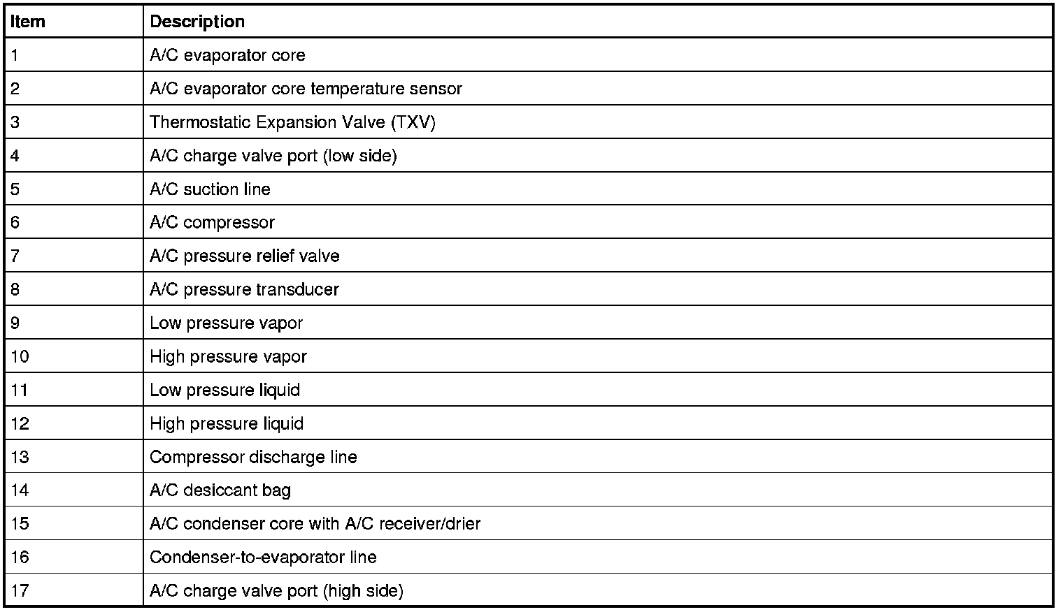 The outlet of the receiver/drier is connected to the Thermostatic Expansion Valve (TXV). The TXV (Thermostatic Expansion Valve) provides the orifice which is the restriction in the refrigerant system and separates the high and low pressure sides of the A/C system. As the liquid refrigerant passes across this restriction, its pressure and boiling point are reduced.