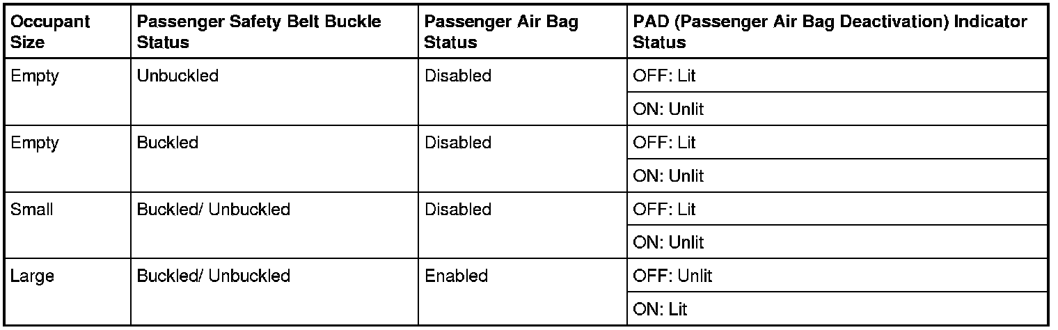 The following table indicates the passenger air bag and PAD (Passenger Air Bag Deactivation) indicator status based on the size of the front passenger seat occupant.