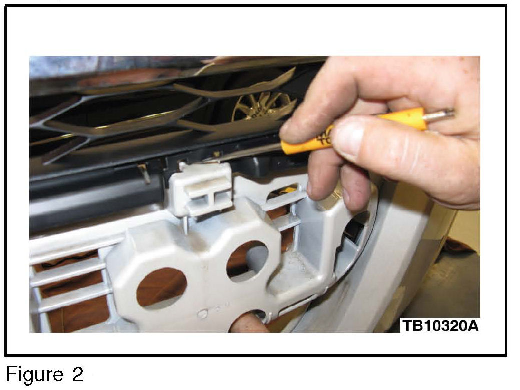4. With aid of an assistant, remove radiator grille reinforcement with trim still attached. For easier removal, first unclip the lower edge of the grille reinforcement using pocket screwdriver. (Figure 2)