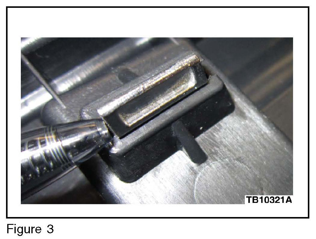 6. On a padded bench, install trim on new radiator grille reinforcement. Verify tabs are fully seated. (Figure 3)