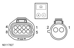 - Measure the resistance between AWD (All-Wheel Drive) relay module, C4379-5, circuit CCF21 (VT/WH), harness side and AWD (All-Wheel Drive) relay module C4379-8, circuit RCF21 (WH/VT), harness side.