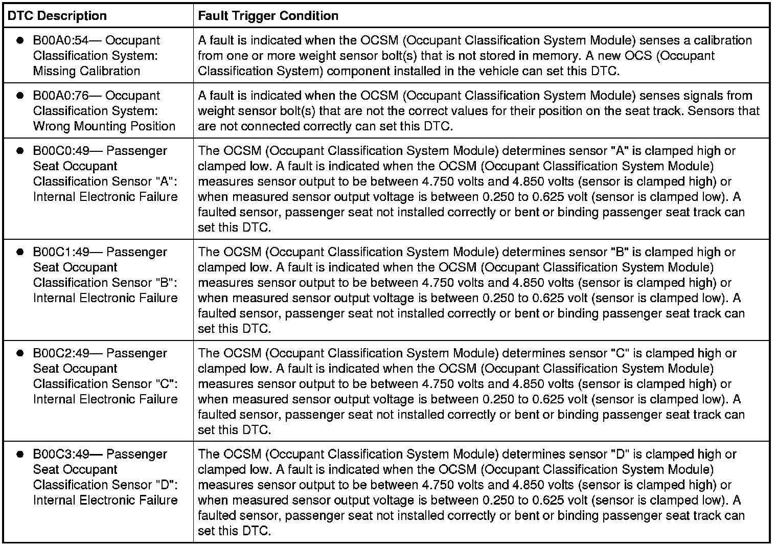 The Occupant Classification System Module (OCSM) monitors each Occupant Classification System (OCS) weight sensor bolt for correct calibration/weight and identification. When the OCSM (Occupant Classification System Module) detects a fault from any of the 4 sensors or if an OCS (Occupant Classification System) component has been installed new, it stores a DTC in memory and sends a message to the Restraints Control Module (RCM).