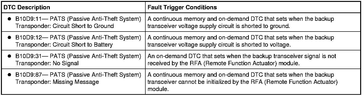 The Remote Function Actuator (RFA) module uses the backup transceiver to operate the Passive Anti-Theft System (PATS) in the event of a failure of any passive start antenna, the battery in the Intelligent Access (IA) key, or a communication concern with the Tire Pressure Monitor (TPM) module. The backup transceiver is also used for IA (Intelligent Access) key programming.