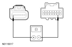 - For a LH concern, measure the resistance between the SOD-L (Side Obstacle Detection Control Module - Left) C4369-6, circuit CRB04 (YE/GN), harness side and ground.