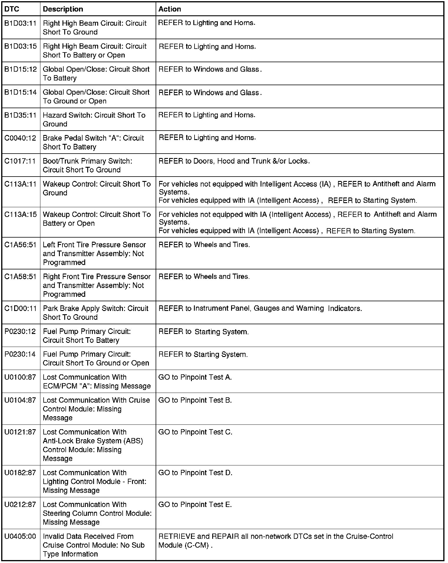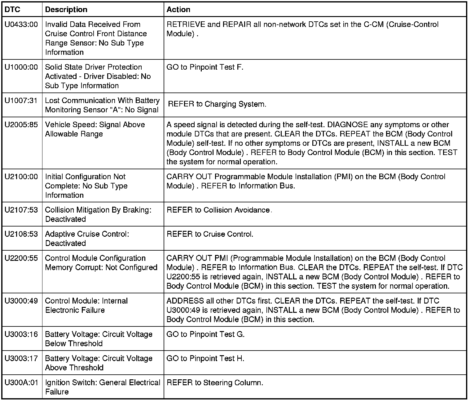 Body Control Module (BCM) DTC Chart