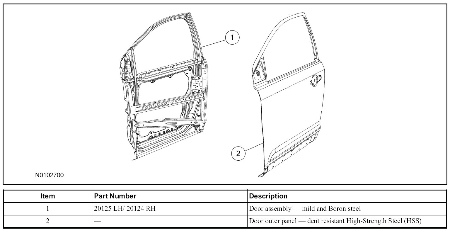 NOTE: Front door shown, rear door similar. Door intrusion beam is constructed of Boron steel and is non-serviceable.