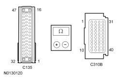 - Measure the resistance between the ABS module C135, harness side and the RCM (Restraints Control Module) C310B, harness side as follows: