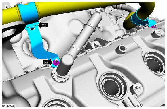 130. Position the 2 power steering hose brackets and install the 2 nuts.