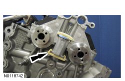 21. NOTE: The 2 VCT (Variable Camshaft Timing) oil control solenoids are removed for clarity.