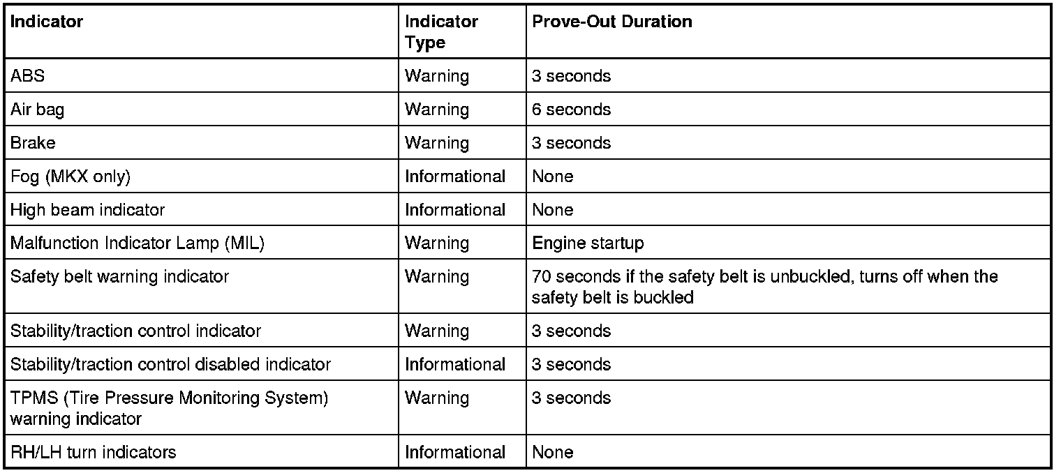 The IPC (Instrument Panel Cluster) and other vehicle modules carry out a display prove-out to verify all module controlled warning/indicator lamps and monitored systems are functioning correctly within the IPC (Instrument Panel Cluster). The IPC (Instrument Panel Cluster) and other modules, such as the Restraints Control Module (RCM), provide a timed prove-out while other indicators illuminate until engine start up. When the ignition switch is cycled to the ON position with the engine off, the indicators illuminate to prove-out according to the following table: