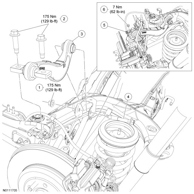 14. With the weight of the vehicle on the wheel and tire, tighten the new upper arm inboard bolt and nut to 175 Nm (129 lb-ft).