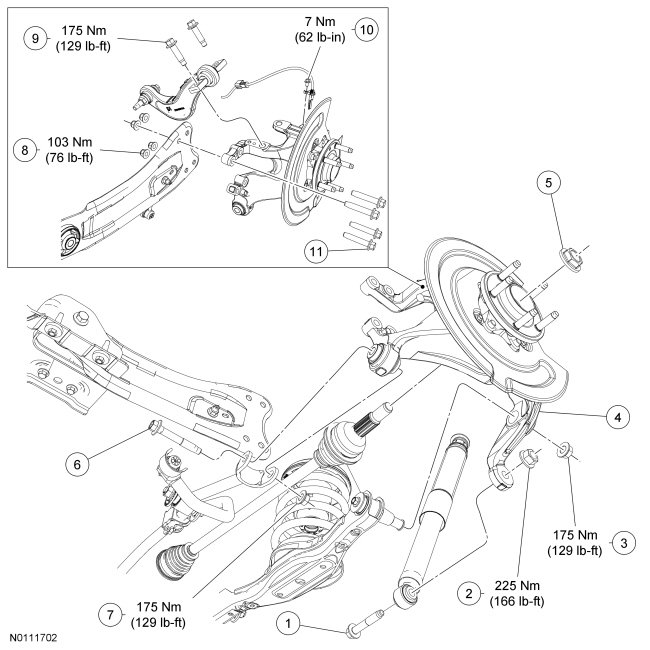 NOTICE: Suspension fasteners affect performance of vital components and systems and their failure may result in major service expense. If replacement is necessary install new parts with the same part numbers or equivalent part. Do not use a replacement part of lesser quality or substitute design. Tighten the fasteners to specification during reassembly.