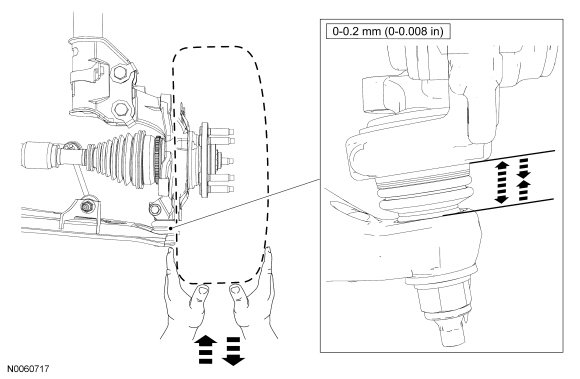 4. NOTICE: Do not use any tools or equipment to move the wheel and tire assembly or suspension components, while checking for relative movement. Suspension damage can occur. The use of tools or equipment will also create relative movement that may not exist when using hand force. Relative movement must be measured using hand force only.