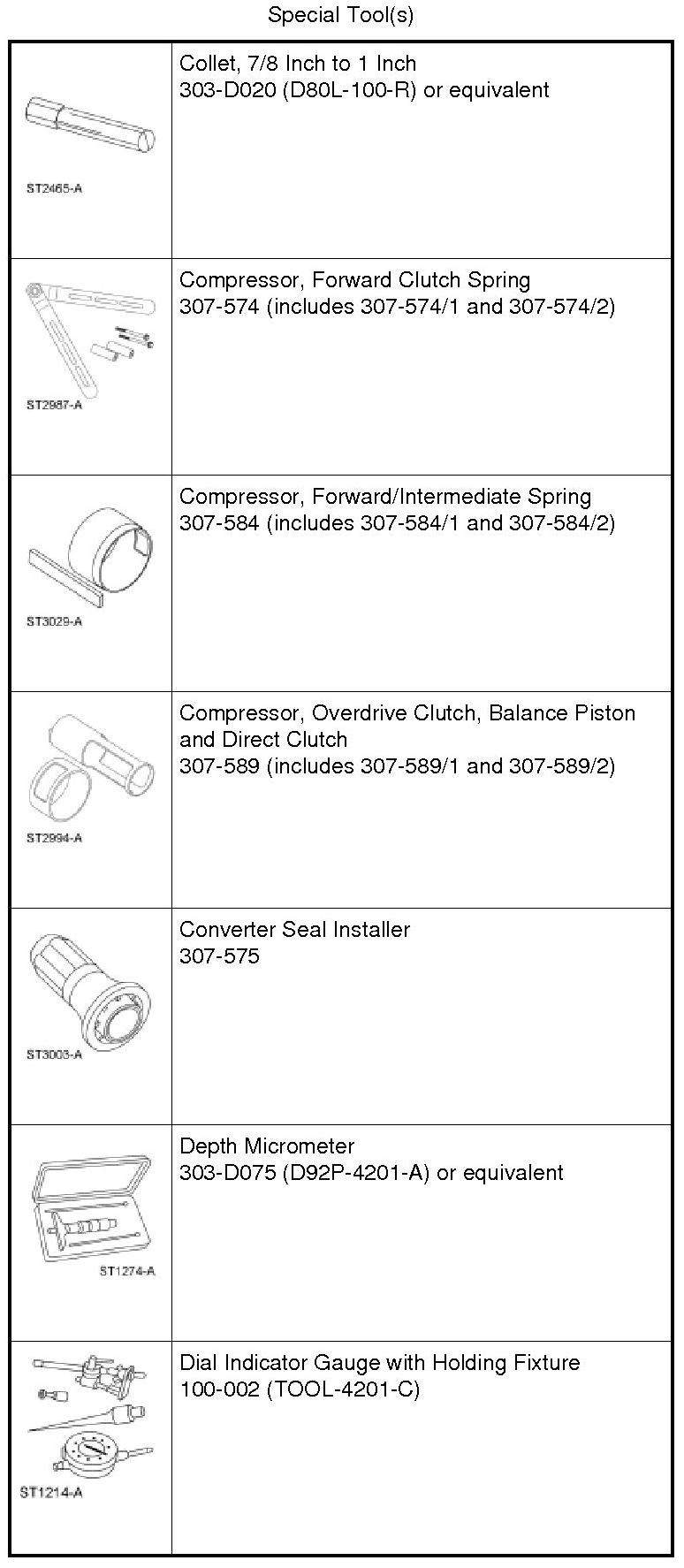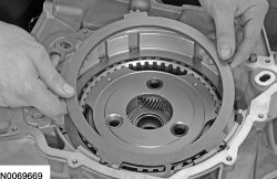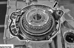 268. Position the Dial Indicator Gauge with Holding Fixture 100-002 on the direct clutch pressure plate. Apply 483 kPa (70 psi) of air pressure to the direct clutch piston port while recording the clutch pack clearance on the Dial Indicator Gauge. The clearance should be between 0.98 mm (0.038 in) and 2.34 mm (0.092 in). If the clearance is out of range, check the direct clutch pack for correct installation. If the direct clutch pack is correctly installed, install a new direct clutch pack.