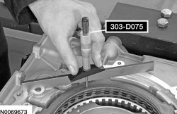 261. Using a straightedge and the Depth Micrometer 303-D075, measure and record as measurement A, the distance from the transaxle case deck surface to a low point on the intermediate clutch wave spring.