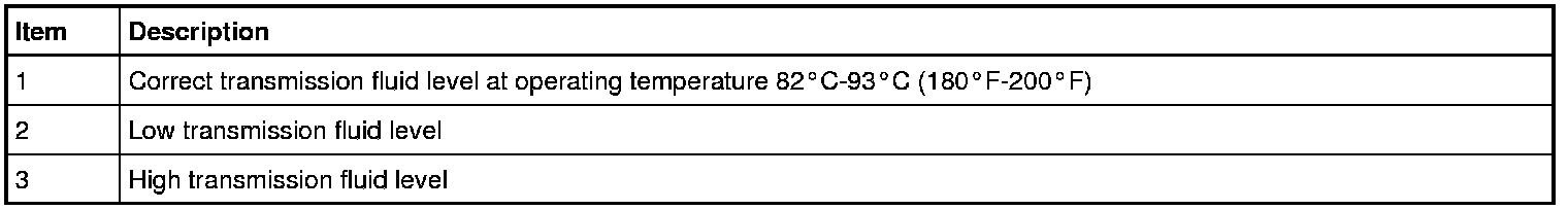 NOTE: The transmission fluid should be checked at normal operating temperature 82°C-93°C (180°F-200°F) on a level surface. Normal operating temperature can be reached after approximately 32 km (20 mi) of driving and can be checked using the scan tool.