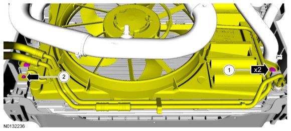 3. Remove the LH transmission fluid tube bracket bolt and the 2 lower cooling fan bolts.