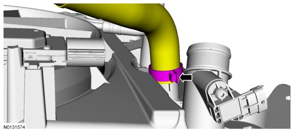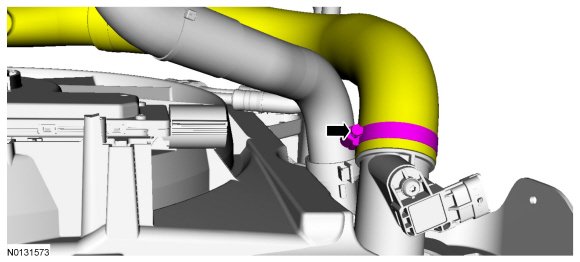 7. Loosen the clamp and disconnect the CAC (Charge Air Cooler) -to-Throttle Body (TB) hose from the CAC (Charge Air Cooler).