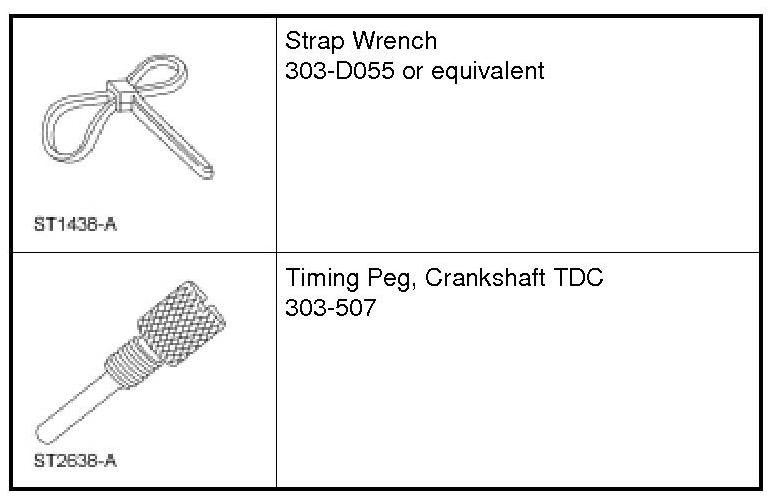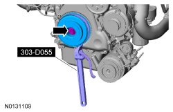 NOTICE: Do not loosen or remove the crankshaft pulley bolt without first installing the special tools as instructed in this procedure. The crankshaft pulley and the crankshaft timing sprocket are not keyed to the crankshaft. The crankshaft, the crankshaft sprocket and the pulley are fitted together by friction, using diamond washers between the flange faces on each part. For that reason, the crankshaft sprocket is also unfastened if the pulley bolt is loosened. Before any repair requiring loosening or removal of the crankshaft pulley bolt, the crankshaft and camshafts must be locked in place by the special service tools, otherwise severe engine damage can occur.