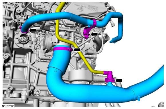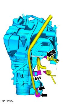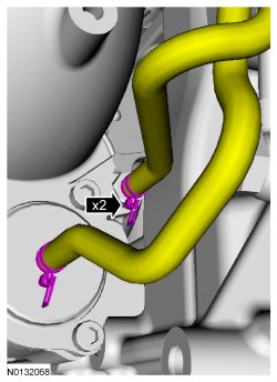 - Connect the turbocharger coolant tube and the 2 clamps.