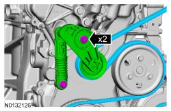 127. Install the accessory drive belt, the accessory drive belt tensioner and the 2 bolts.