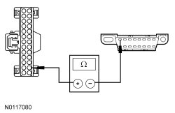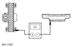 - Measure the resistance between the ACM (Audio Front Control Module) C240A-14, circuit VDB13 (BU/GY), harness side and the DLC (Data Link Connector) C251-1, circuit VDB13 (BU/GY), harness side.