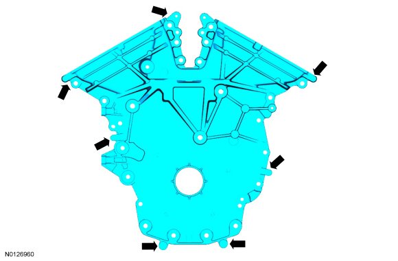 - Apply a 5.5 mm (0.21 in) bead of Motorcraft(R) High Performance Engine RTV Silicone to the oil pan-to-cylinder block joint and the cylinder head-to-cylinder block joint areas of the engine front cover in 5 places as indicated.