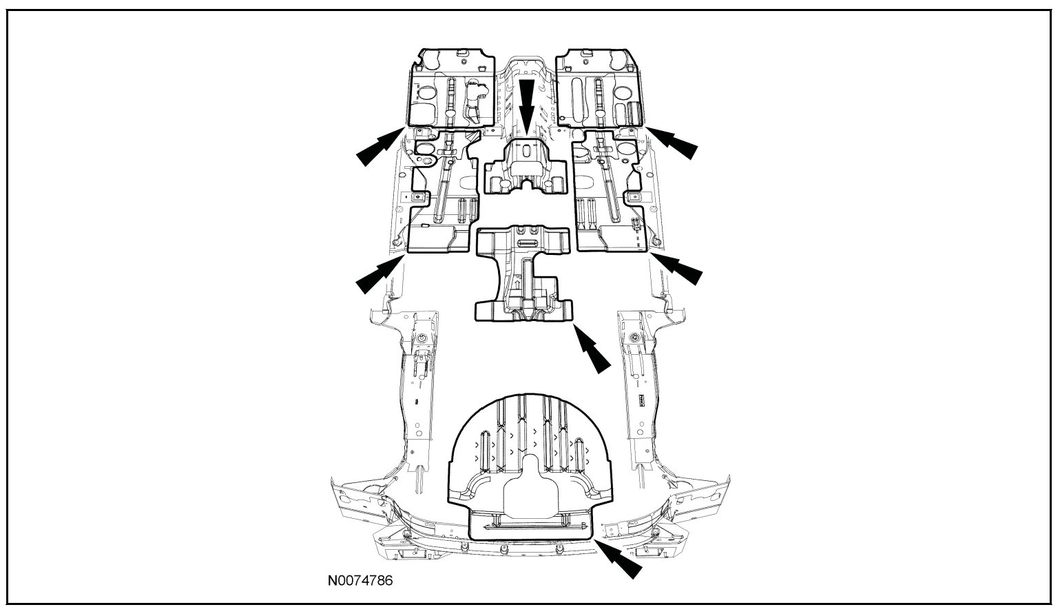 - The following illustration serves as a reference to indicate mastic patch (butyl pad) locations. Additional insulators and sound deadeners are used beyond those indicated in the illustration.