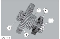 Inspect the transfer shaft for damage or excessive wear. Inspect the bearings for excessive wear or damage and inspect the park pawl wheel, transfer shaft and transfer shaft input gear for damage. Install new bearings, park pawl wheel, transfer shaft or transfer shaft input gear if damage or excessive wear is found. For additional information, refer to Transfer Shaft and Gear . If the transfer shaft bearings are replaced the bearing races in the transaxle case and the torque converter housing case must also be replaced. For additional information, refer to Transaxle Case and Torque Converter Housing . If the transfer shaft is replaced, the differential ring gear must also be replaced. For additional information, refer to Differential Gear Assembly .