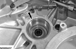 Inspect the transaxle case side differential bearing cup for damage. If the transaxle case side differential bearing cup is damaged, install a new bearing cup. For additional information, refer to Transaxle Case . If a new bearing cup is installed in the transaxle case, install a new differential bearing cup in the torque converter housing. For additional information, refer to Torque Converter Housing . If a new bearing cup was installed, the differential bearings must also be replaced. For additional information, refer to Differential Gear Assembly .