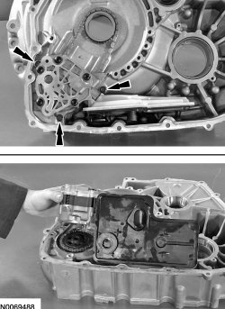 53. NOTICE: Carefully pry on the transaxle torque converter housing and the case to separate the torque converter housing from the case. Do not pry up on the silicone sealant mating surfaces, damage to the mating surfaces may occur. Carefully lift the torque converter housing off the dowel pins.