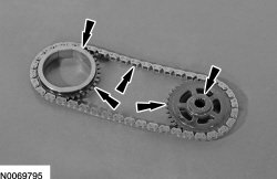 76. Inspect the pump chain and sprocket assembly for damage or wear and install new components as necessary.