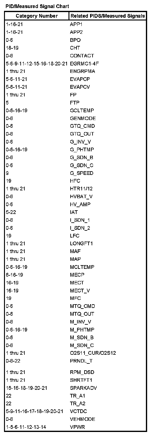 REFERENCE VALUE PID/MEASURED SIGNAL CHARTThe listing reflects PIDS and/or measured values which may reveal a possible concern within each system shown. Match the category number with the related PID/measured signal and go to the Typical Diagnostic Reference Value Charts. Typical Diagnostic Reference Values