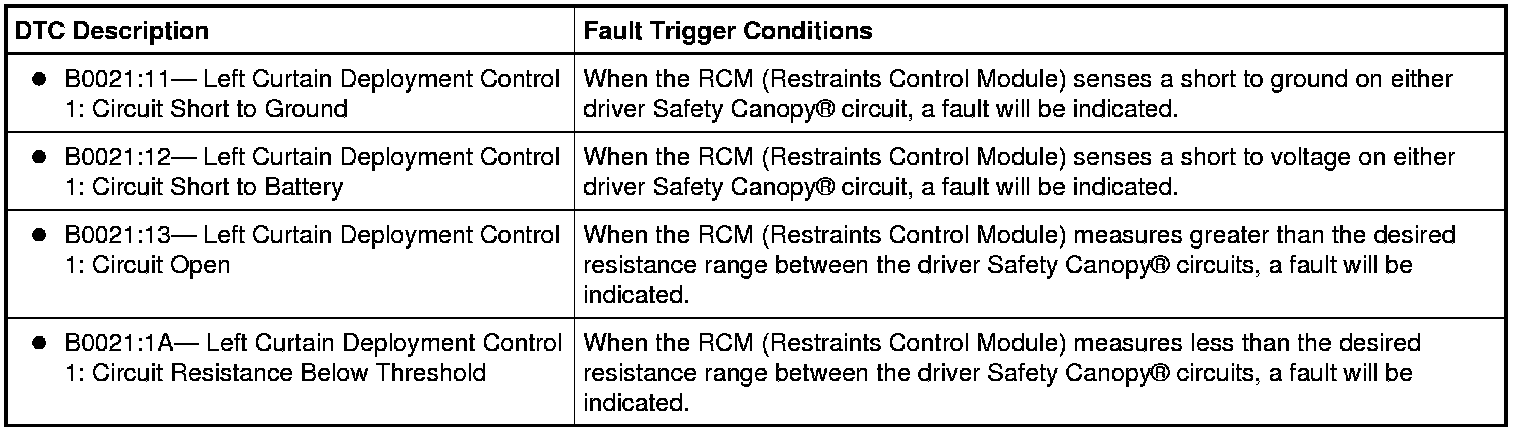 The Restraints Control Module (RCM) continuously monitors the driver Safety Canopy(R) and circuits for the following faults: