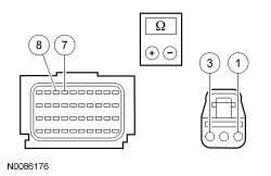 The RCM (Restraints Control Module) analyzes the deployment loop resistance and uses this measurement in combination with an age correction factor to determine if a fault exists. The value displayed in the PID is the deployment loop resistance as measured by the RCM (Restraints Control Module). If the value displayed is lower or higher than the desired range (refer to diagram below), the RCM (Restraints Control Module) can set a DTC. As the deployment loop resistance drifts farther outside the desired range, the chance for a DTC increases. The RCM (Restraints Control Module) fault trigger threshold may vary as the vehicle ages. Small variations in resistance can occur due to the effect of road vibrations on terminal fit and/or temperature changes. These variables can result in an intermittent fault. For this reason, the test will require the PID value to be within the desired range before the fault is considered repaired, regardless if the module is reporting an on-demand DTC at time of diagnosis. Following this direction will help make sure that minor changes in resistance do not create a repeat concern. This test will use a process of elimination to diagnose each part of the deployment loop circuit including: