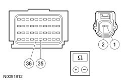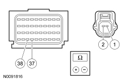 - Measure the resistance between RCM (Restraints Control Module) C2041B, harness side and passenger second row C-pillar side impact sensor C3212, harness side using the following chart.