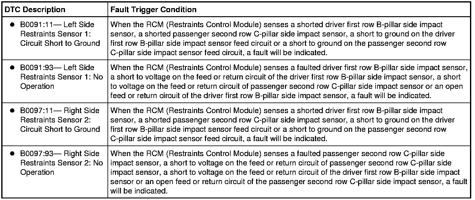 The Restraints Control Module (RCM) monitors the driver first row B-pillar and passenger second row C-pillar side impact sensors and circuits for the following faults: